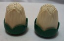 Jay Don plastic eggplant shakers, Green base & white top, these are petal like shakers that resemble eggplants, but might be a different vegetable. The white tops screw onto the base, & they are hard to line up but they do hold tight. Mint condition 2 1/4 x 1 3/4" Marked Jay Don on the inside.
