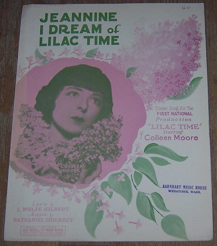 Jeannine I Dream of Lilac Time Theme Song for the First National Production Lilac Time Starring Colleen Moore. Lyric by L. Wolfe Gilbert and Music by Nathaniel Shilkret. 1928 Leo Feist. Sheet Music is in good condition, wear at edges, spine is taped, previous owner's name on front cover