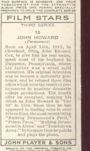 John Howard Film Star Tinted Card 1938, Third series #18 , Studio signed (artists signs original & then they print signature on card or photo) features his original intention was to become a college professor and he refused 3 offers which were the result of performances in amateur dramatic college productions. 4th offer he accepted making his debut in Car 99. Other movies followed. by the John Player & sons company branch of the Great Britain & Ireland Ltd, Mint condition This cigarette card is 1 1/2 x 2 1/2" Please note photo is larger than actual card. Postage in the USA will be 34 cents & other countries will be aprox 1.00 you pay only actual postage, no more than 5.00 if you want global priority.