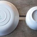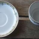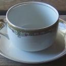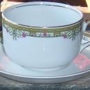 Johnson Bros Cup and Saucer. Pink, Gold and Green Deco Design at edge. Gold trim at edges, inside Cup and Cup handle. Good condition.