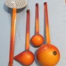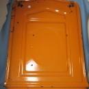 Burnt orange with original utensils. Very nice condition with some enamel nicks as shown in the photos.