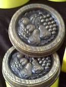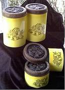 Talk about "DejaVu"! I had a set of these in the 70's, only mine were cream colored with a colorful fruit decoration. The canisters themselves are in good condition, a few minor surface scratches, but not bad. But, these have the same problem mine did. If you shoved the lids down too hard, you would split the sides if the lids. Three of these have those splits. But, the lids still sit well on the canisters and look good. They were never "airtight" and are definately not now, but would hold packaged things like candy, individual snacks, etc. They range in size from 8"X4 1/2" for the two tall ones to 3 1/2"X4 1/2" for the short ones.
