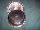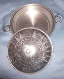 Here is a lovely little lided aluminum bowl. It is small, approx. 7" across(9 5/8" with handles) and 1 1/2" deep(3 1/2" from bottom of bowl to top of knob). It has a pretty embossed floral design around the knob on the lid. It has a pie crust edge around the bowl and lid. The handles are grapevines coiled. The mark on the bottom is for Royal Sealy Japan. The shipping fees quoted are for priority/No insurance in USA only. Thank you for looking!