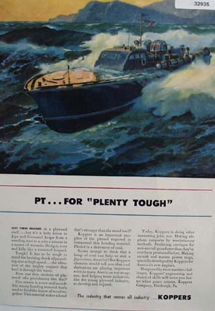 Koppers Co. Engineering and Chemical 1943 Ad. This color August 2, 1943 ad states PT for Plenty Tough. Just three engines in a plywood shell, but its a holy terror to Japanese and Germans. Leaps from a standing start to a mile a minute in a matter of seconds. Dodges, runs and kills like a cornered leopard. Picture shows PT Boat in choppy Island Seas. Magazine tear sheet picture is taken through plastic and may show wrinkles or crookedness that is not in the ad. This original magazine tear sheet measures 8 inches wide by 11 inches tall.