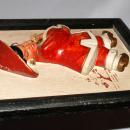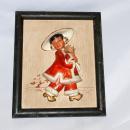 Kreiss & Company Chalk Asian Lady, Girl in 3-D Wall Art, Plaque, Framed Picture Old and RARE. The lady dressed in red and white with gold trim and red shoes is holding a straw bundle as to represent a bouquet. The chalk figure is mounted on what looks like rice paper with a tree painted in the background. There are a few nick there and there but nothing that stands out. The frame shoes wear. It is marked on the back "Kreiss & Company. The frame is 8.5" x 7".