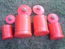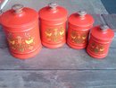Set Four graduated style dry goods storage canisters. Retro 1970's Era bird flower decals. Steel cylinder tubs, plastic lids & wood fenials. Fair condition-some decal loss, plastic coated bubbling in spots. Kromex USA marks.