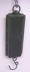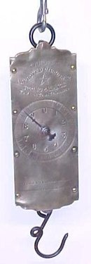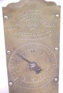 This is a nice clean hanging type, 30 pound maximum spring scale marked "LANDERS IMPROVED CIRCULAR SPRING BALANCE TO WEIGH 30 BBS BY OUNCES EACH 10 # IS MARKED ON THE SLIDE THE INTERMEDIATE WEIGHTS ON THE CIRCLE" on the brass face or cover plate. The slide mentioned is also brass and has the 10 pound markings and graduations on it. The scale can be used with a pan that is hung from the extra loop on the hook if you have one. The scale is in working condition, as you can see the brass cover plate has some bends and dings in it near the top and bottom mostly, the area around the circular dial is in very good shape, good indicator pointer, and the ring and hook are in nice shape. The back frame of the scale is cast iron with about 90% of the black paint intact, no rust, clean, no damage or cracks on the iron. The brass plate measures 4.25" wide x 10.8 high. A nice heavy duty antique hanging scale overall!