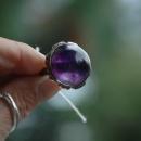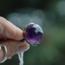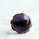 Large Amethyst and Sterling Silver Vintage Ring. The stone is a rich purple, super high quality. The scalloped bezel has copper cross pieces inlay that does not really show up in the pictures. The diameter of the setting is a hair over 8 inches. The stone raised above the setting by 10 cm. The ring part is slightly out of round. It is hand crafted and lovely.