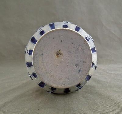 This particular jug is unmarked, lacking any identifiable stamps or markings. However, it is interesting to observe that several other Westerwald pitchers with similar features, decorations, colors, and base finishes, also unmarked, can be found in the collections of various museums. Remarkably, these similar jugs are dated to the 17th century.