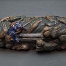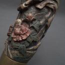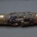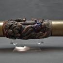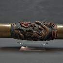CONDITION: The pipe is in good overall condition with a nice patina indicating its age and uses, with signs of age-related wear and flaking of the paint. One of the smaller Shishi's feet is slightly chipped.