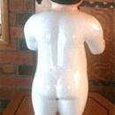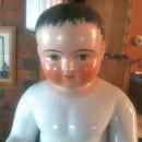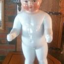 All china doll: (16 1/2 inches long) with black molded hair. HE has painted features on the face. Hands are extended and legs are separated but not jointed. This frozen charlotte is in excellent condition. There are no marks as to the maker which is normal for this type of doll.