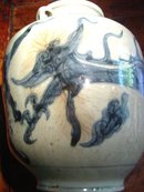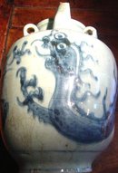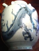A very lively dragon spirals around the body of this large blue-decorated porcelain wine jar. Aside from two craquelure webs and a small pewter plug, the piece is in excellent condition, with no breaks or chips. Chinese, Eighteenth Century, approximately 10-1/2 inches tall and eight inches in diameter.