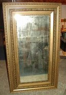 Large mirror in gilded ornate frame. Probably from turn of the 20th Century. Mirror needs to be re-done because of age, but the frame is in excellent condition. Measures 41 X 17. With the frame it's 53 X 30.