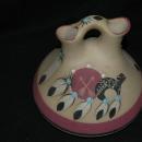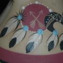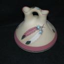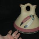 Large Native American Wedding Vase by Betty Selby signed and numbered. It is 7.25" high and has a wide base that is 9.5 across. It is unglazed with a sandy texture decorated with raised feathers and dot of turquoise and white. There are also a spirit bear and arrows. It is signed and the numbered 398. Faintly I think I see a date of '99.