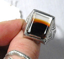 Montana Moss Agate ring. This type of stone is also known as a picture agate. This one is has dark to lighter brown bands 3/4" of the ring then it fades into clear. The stone measures 7/16" x 5/8" The ring is approx a size 9.