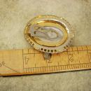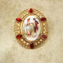 This large fur (or dress) clip holds a victorian courting couple in the center accented with red marquise rhinestones. The colors are quite beautiful and the stones really bring out the portrait. It has light gold wear and could be worn on a scarf. hat or even on a necklace.