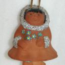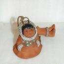 Lovely handcrafted red clay pottery bell or wind chime from Alaska. Depicts a native Alaskan holding a basket bouquet of forget-me-nots . Clearly marked on the Made in Alaska with the incised signature and signed by Barbara Lee.