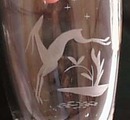 Lead crystal gazelle leaping vase, Orrefors ? Appears to be a high quality lead glass with a cut & acid etched design. Gazelle appears to be leaping under the stars & into the water. You can even see the ribs on the graceful gazelle. This piece is not signed, but looks like Orrefors sweedish glass. Ground & polished bottom & ground top. Mint condition, 4 3/4 x 3 1/2"