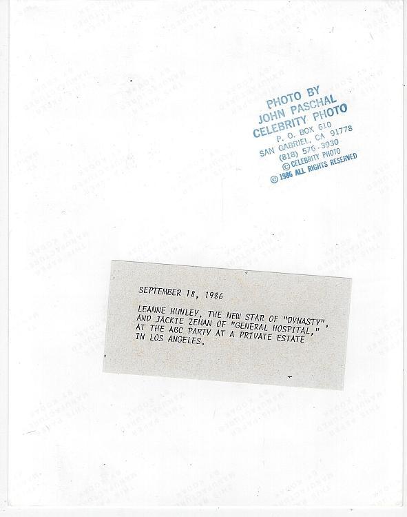 Original Photograph of Leanne Hunley, Dynasty and Jackie Zeman, General Hospital at a Party, September 18, 1986. Taken by John Paschal Celebrity Photo 1986. Photograph is 9" high and 7" across. Good condition, suitable for framing
