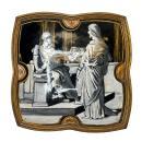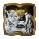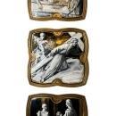 Our three nineteenth century enamel plaques, attributed to masters in Limoges, France, depict scenes from the Stations of the Cross, aka Via Dolorosa and Via Crucis, depicting events of Jesus Christ on the day of his crucifixion. Each approximately 9 1/2 inches (24.1 cm) square. In grisaille enemals with gilt highlights in quatrefoil shaped frames.