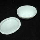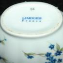 Limoges France Forget-Me-Not flowered Porcelain Trinket Box, Container with Lid. It also has raised textured trim border on the lid as well as the bowl. I measures 4" long x 3" wide and it about 1.75" tall included the hump on the top part of the lid. Judging by the marks on the bottom it is not old but I have not been able to find out any information on the maker of this item. ( However it is not a knock off). It is a very lovely little container in excellent condition.