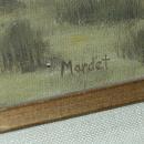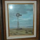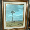 Windmill Acrylic Painting Signed Mardet Framed Behind Glass . The windmill looks to to be on a ranch or farm standing to the left of center in a field of gentle rolling hills. It looks lonely against the cloudy sky, which appear to be threatening to rain. The wood frame it mounted in is 16" x 13.75". The canvas is 10" x 8.25".