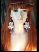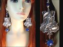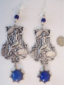 These gorgeous pierced long nude nymph earrings, with an 8 ct chalcedony stone set in a sterling ships wheel bottom are a whopping 5 1/2" long (from top of wire to bottom of the chalcedony setting). THe top stone is a genuine lapis, set in a very detailed silver setting. Mucha, a well known art nouveau artist is known for these figures, with many depicting the moon and the stars and exotic nymphs.. As you can see on our model they are very dramatic and with her red hair they really look like she has walked out from a past life. Purchased in Paris years ago these have never been worn, only displayed in our store. I loved them too much to sell them since they looked so well on our mannequin. Now that our physical store is closed I hope they can find a home where they they will be as loved and adored as they have been with me. THe bottoms settings are marked 925. The rest is not marked so I am not sure of the silver content.