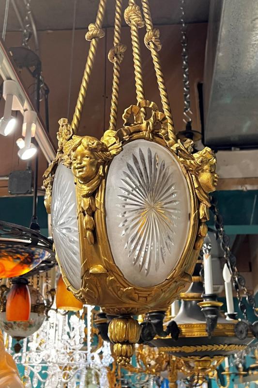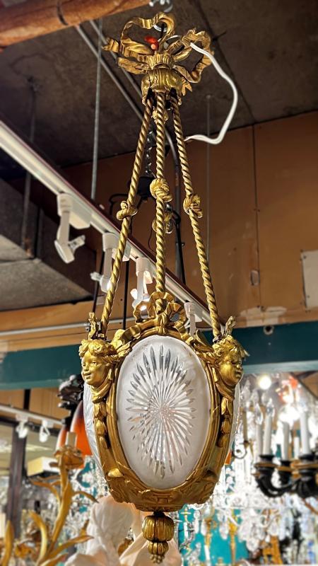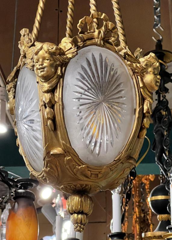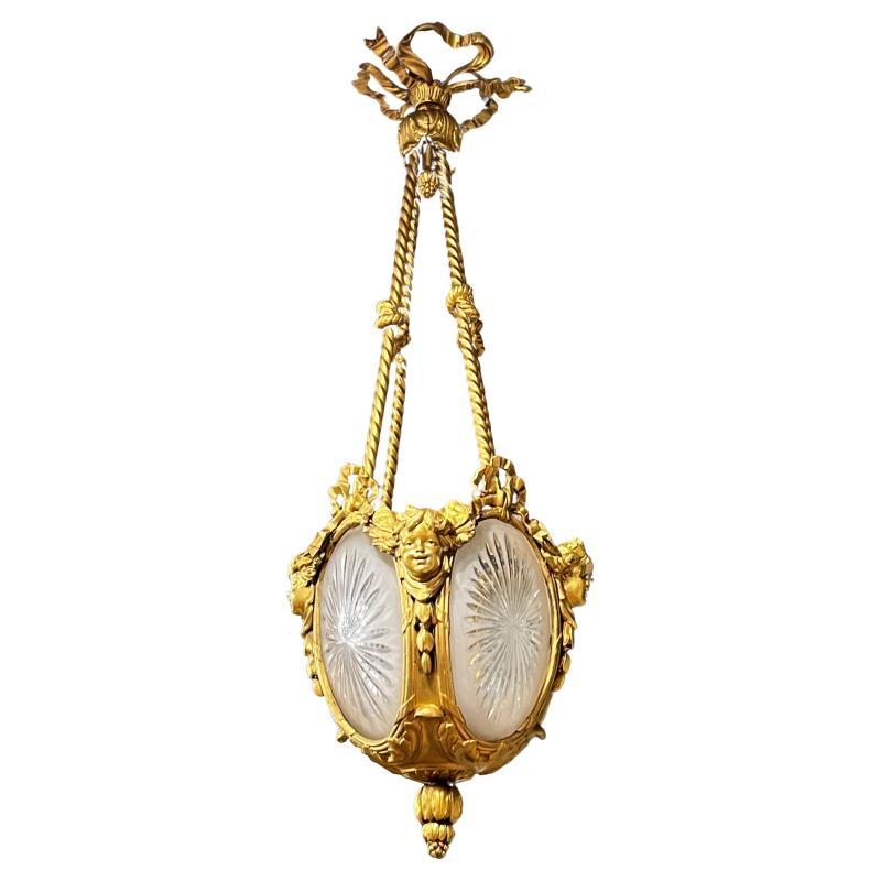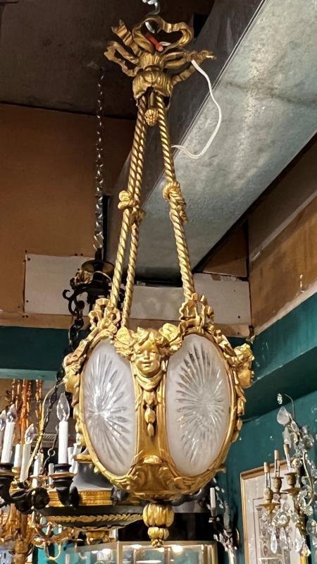 Our gilt bronze lantern-form chandelier in the Louis XVI stye features four engraved glass panels and cherub masks at the corners, and suspended from four drapery form supports surmounted with ribbon form motif at the top. With modern sockets and wiring and ready for installation.