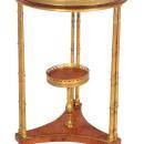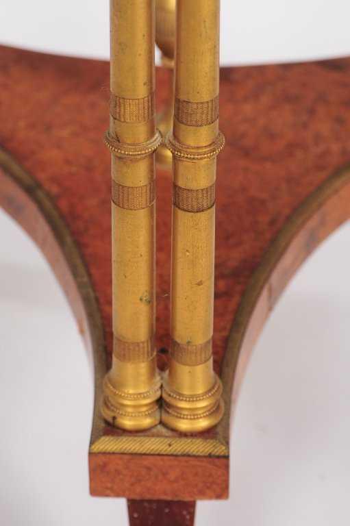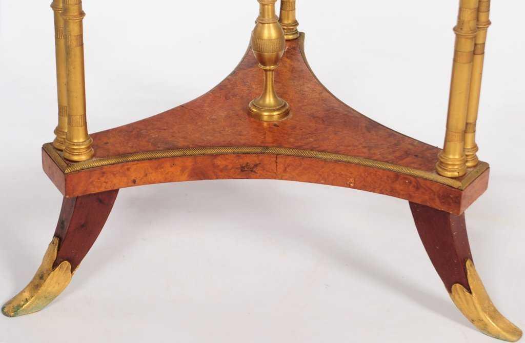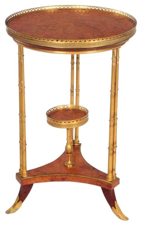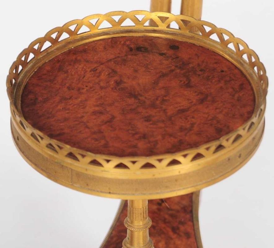 Our exceptional Louis XVI gueridon in the manner of Adam Weisweiler (1744-1820) features a circular top of burled amboyna with pierced, gilt brass gallery, supported by three pairs of bamboo form bronze upwrights joined by a concave shaped tripart stretcher of burlwood with galleried tazza of burlwood, raised on three splayed legs with bronze sabots. 31 x 20 x 20 in; 78.7 x 51 x 51 cm. Condition is very good, with some loosening, visible crack to the amboya veneer on base, and signs of verdigris visible on the bronze feet and small spots on the top gallery.