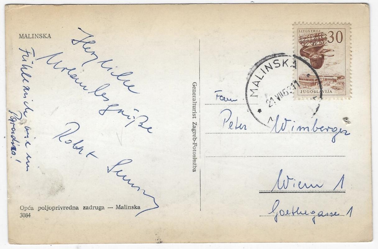 Postcard of Malinska, Yugoslavia. Back is postmarked. Postcard is in good condition, wear at edges.