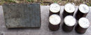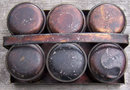 Metal Spice Carrying Caddy with Handle and Six Spice Canisters with Lids. Includes Mace, Ginger and Allspice. Tray is 7" long, 4 1/2" high and 4 3/4" deep. Canisters are 2 3/4" high and 2 1/2" across. Good Condition, Canisters and Tray have some wear.