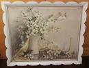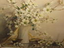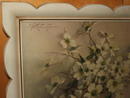 Beautiful vintage, mid-20th century framed print of still life with dogwood blossoms, by Volney Allen Richardson, born 1880, an American Impressionist who worked in oils. This piece, entitled "Melody in White", is in the original scalloped, white-washed wooden frame. The framed piece measures approximately 28.25 inches high, 34.25 inches wide, and 2 inches deep; it weighs about 12 pounds. The image measures approximately 29.5 inches by 23.5 inches. The print, frame, and glass are in very good to excellent condition, with minimal surface wear on the frame. Please refer to the 4 photographs for appearance and condition. Shipping / packaging / handling of this substantial piece will be $30 - $60, depending on the zipcode of the buyer.