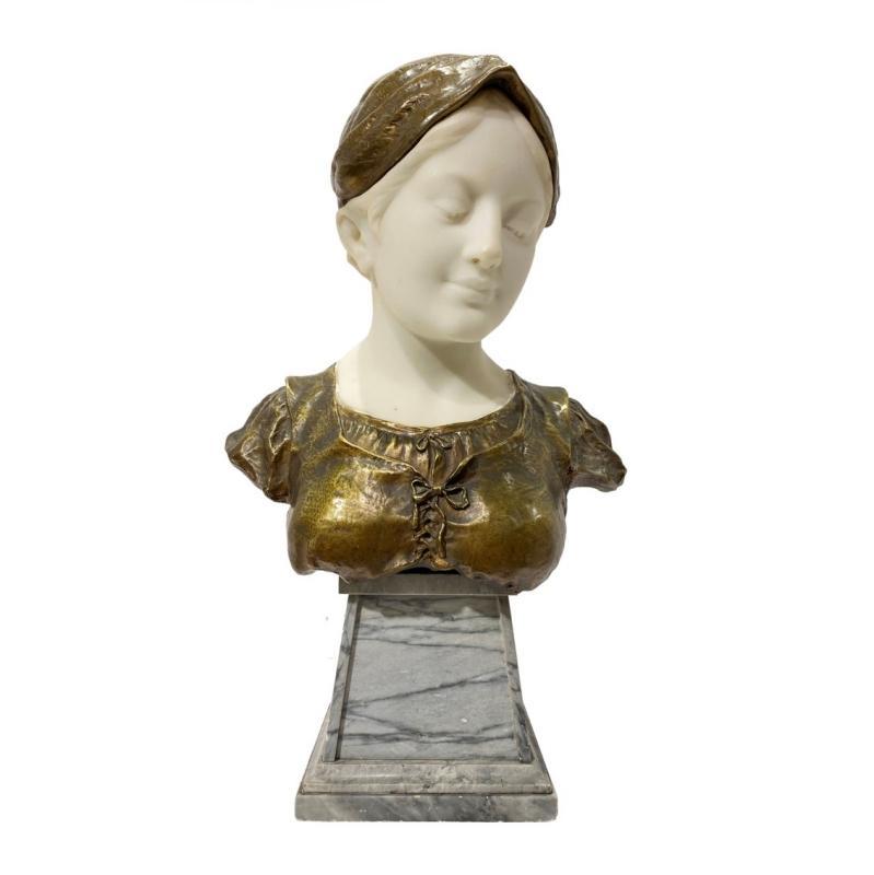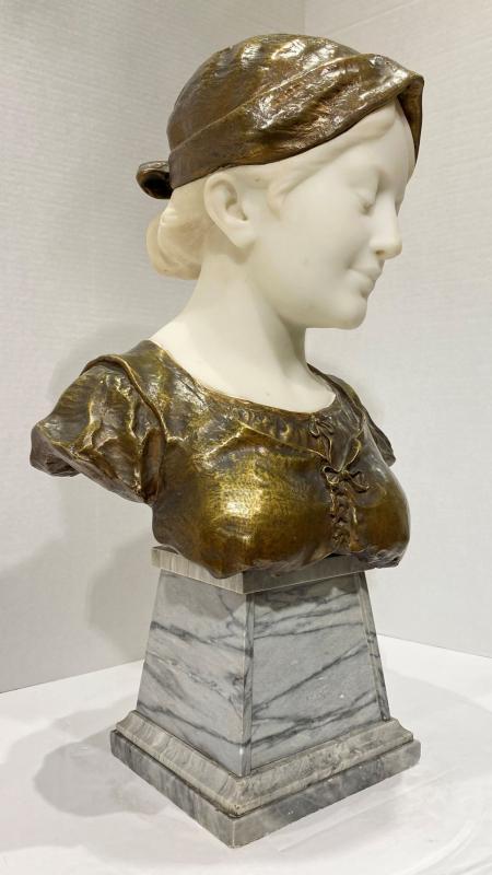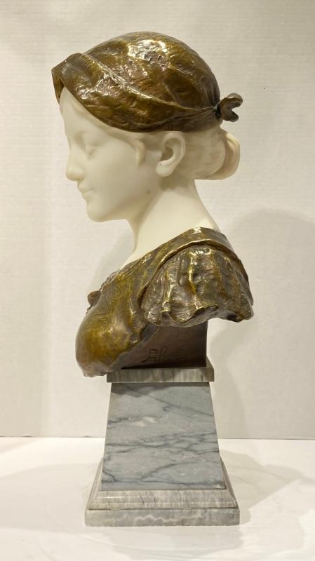 Our lovely bust of a young woman by Dominique Alonzo is crafted from sculpted white marble and bronze, and set upon a pedestal wrapped in variegated blue/white marble.