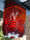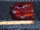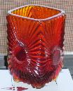 Circa 1886 most unusual RIBBED + BULLSEYE + FOOTED AMBERINA Glass toothpick holder , research indicates C.1886 Ribbed effect on outer surface, Reverse Bullseye each at different height on panels. Footed.