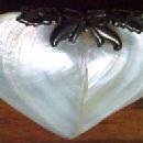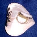 This little purse is in the shape of a heart. It has a sterling clasp and loop around the opening with a Mother of Pearl lid. It is held together byplated or sterling flowers and leaves. A chain could be inserted here for security. We accept VISA, MASTERCARD, DISCOVER, and AMERICAN EXPRESS payment via Paypal or you can pay with a money order or check. Buyer pays S&H. To receive additional information or to order this item, please email Greg or Bonnie direct if you have any questions regarding this item or by telephone (231) 943-3658. Click to return to our HOME PAGE