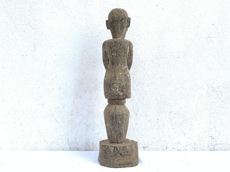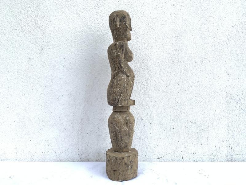 An old ancestral Kayan Patong statue, the naked statue is seen kneeling on top of a tajau/jar. Ritualistic Patong. Kalimantan Borneo. Circa 1970. Ironwood.