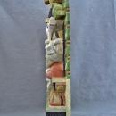The sculpture is finely hand-carved in high relief with grate details from a single block of wood and hand painted with bright colors.