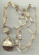 A really pretty necklace made up of an interesting goldtone chain with faux pearls and amber colored beads. The large drop has a wonderful amber colored lucite (I believe it is lucite)stone with imbedded gold foil. The chain is approx. 24" long. The drop is approx. 1 1/4"X1". The fe quoted for shipping is for first class/insured in USA only.