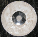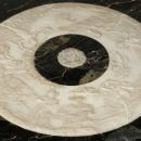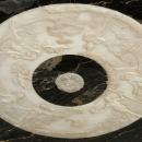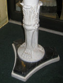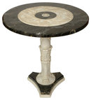 This lovely Italian marble center table features neoclassical carved figures in a ring around the center, and a variegated black/grey marble top. The pedestal features carved grape bunches, acanthus leaves and animal claw feet resting upon a five-sided base. It measures 31" tall and 29.5" in diameter.
