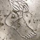 Very large steel pie pan with embossed "Mercury / winged foot" logo for the New York Athletic Club. Circa 1930's-50's. Measures 11 5/8"d x 1 1/4" deep. The club was established in the 1860's to promote the development of sports in the United States, and the historical building still stands on the southern border of Central Park in New York City. The building houses sports facilities, guest rooms, bars and a restaurant (hence, the pie pan!). Pan has a few small dents, tiny rust spots and some use scratches as expected. Sold as is. Inglenook Antiques...Established 1989.