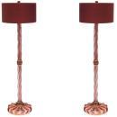 Our extraordinary pair of contemporary Piroetta Bassa (Dancing Piroette) floor lamps from Donghia were crafted in Murano Italy and are made from hand-blown cranberry colored glass with brass fittings and their original matching, upholstered shades. Each 60 in tall with bases 13.5 in across (152 by 34 cm). This model dates from the 2010s.