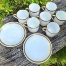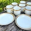 Set of Noritake "The Crete" pattern demitasse (7) cups & (2) saucers. Marked with the "M" in wreath, circa 1920's. White body with black and metallic gold trim in a Greek key design. Saucer measures 4 5/8"d, cup 2 1/4"h. Very good condition with no chips or cracks. Sold as a set of 9 pieces. Inglenook Antiques...Established 1989.