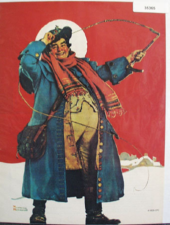 Norman Rockwell 1980 Picture. This October, 1980 Picture shows smiling heavy set man in Blue coat, hat, red scarf around neck with a whip in his hand. This Picture was copyrighted in 1929. Shows a snow scene with red background. Magazine tear sheet picture is taken through plastic and may show wrinkles or crookedness that is not in the ad. This Original magazine tear sheet measures 8 1/4 inches wide by 1o 3/4 inches tall.