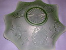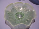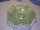 Beautiful Old Northwood Blossoms and Palms Ruffle Edge Bowl. Done in an aqua green opalescent glass with a center star. The bowl is about 2 1/2 inches high and 9 inches across, with flowers and open palm leaves around the bowl. In excellent condition with beautiful color, there are no chips, cracks, scratches or repairs. See the other carnival items we have listed. We are happy to combine items for shipping when possible.