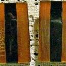 Rectangular clip-on earrings made of root beer brown bakelite with black stripe insets. Measure 1" x 1 5/8". Has crackle texture to rootbeer. Sold as is. Price reduced from 50.00. Inglenook Antiques...Established 1989.