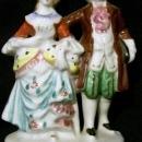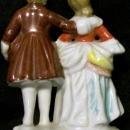 Colonial couple figurine made in Occupied Japan, 1945-52. Black mark on bottom. Hand-painted multicolor shiny glazes with gold trim. Measures 4.75"h. No chips or cracks. Inglenook Antiques...Established 1989.