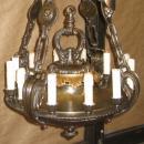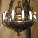 Our fine chandelier in the French empire style, modelled after a colza oil lamp, features twelve electrified candles, and measures 35 in tall and 20 ina cross (89 by 51 cm). Recently cleaned. With old faux wax candle covers (some missing).