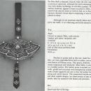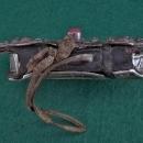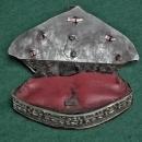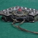 The center of the flap is adorned with large red coral mounted in a high silver setting with a rosette base mounted on the brass plaque adorned with two golden fishes. The back of the flap is lined by a metal plate affixed with a small catch that holds the purse closed. The purse retained its original suspension leather strap.