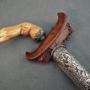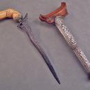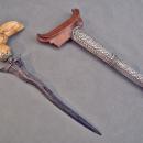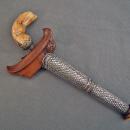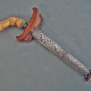 The scabbard made of wood is covered in a silver Pendok, which consists of two distinct parts that are finely repousse and engraved on the exterior with a scrolling foliage and checkering pattern on the reverse. The wooden warangka, in the form of a European sailing vessel, is finely carved with traditional Malay design. The bottom of the scabbard is adorned with a large carved bone finial.