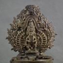 The lamp features a beautifully crafted floral aureole that showcases the figure of Avalokiteshvara, who has forty arms and eight heads at its center. The lamp includes a ladle spoon designed for oil, with the ladle stem handcrafted from a copper alloy. The finial is intricately cast and hand-chiseled in the shape of a peacock.